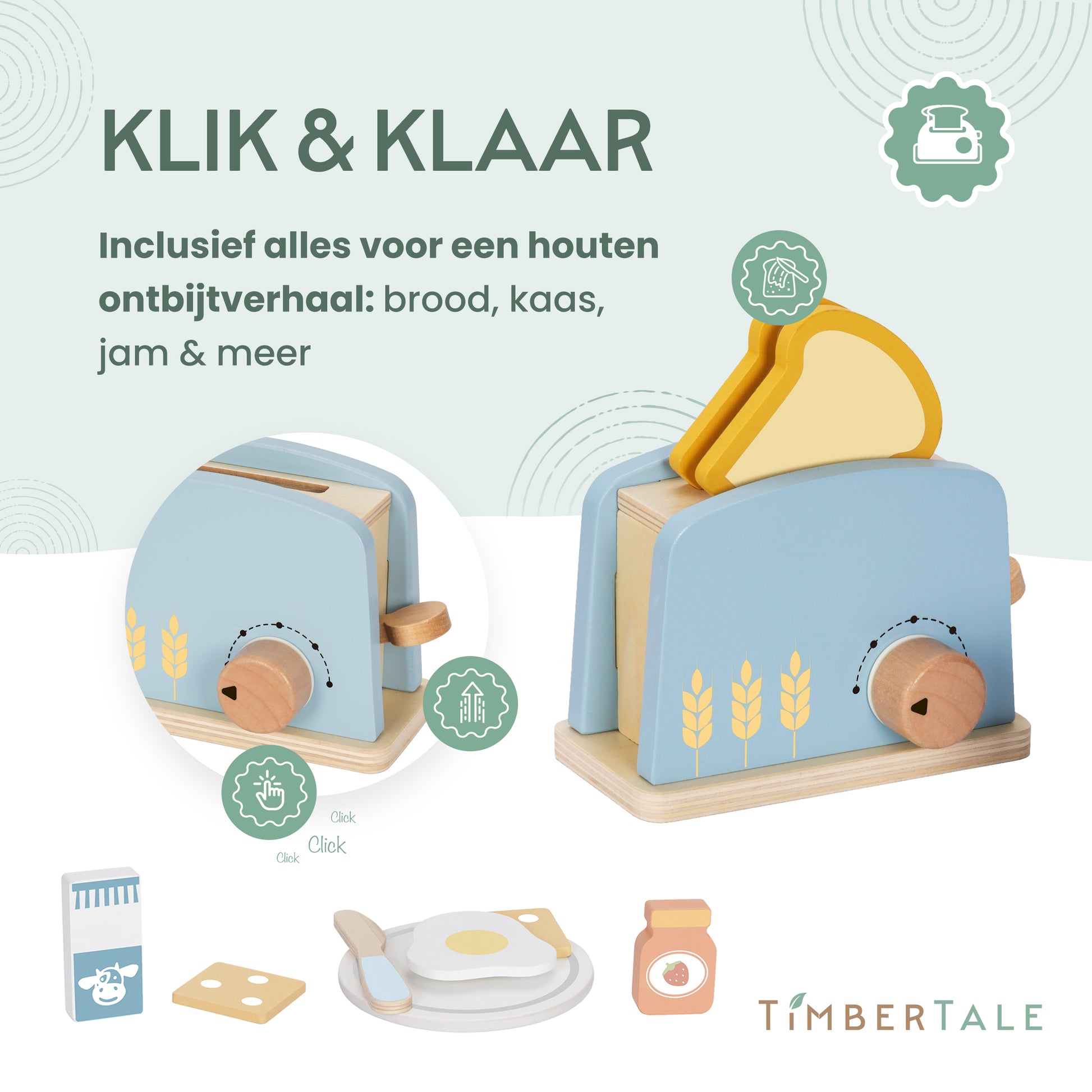 Goedemorgen kleine chef! Met deze TimberTale houten broodrooster ontbijtset start je elke dag met een lach. Rooster je boterhammen, smeer jam en schenk melk voor je knuffels of papa en mama. Fantasievolle ontbijtmomentjes vol spel en plezier!